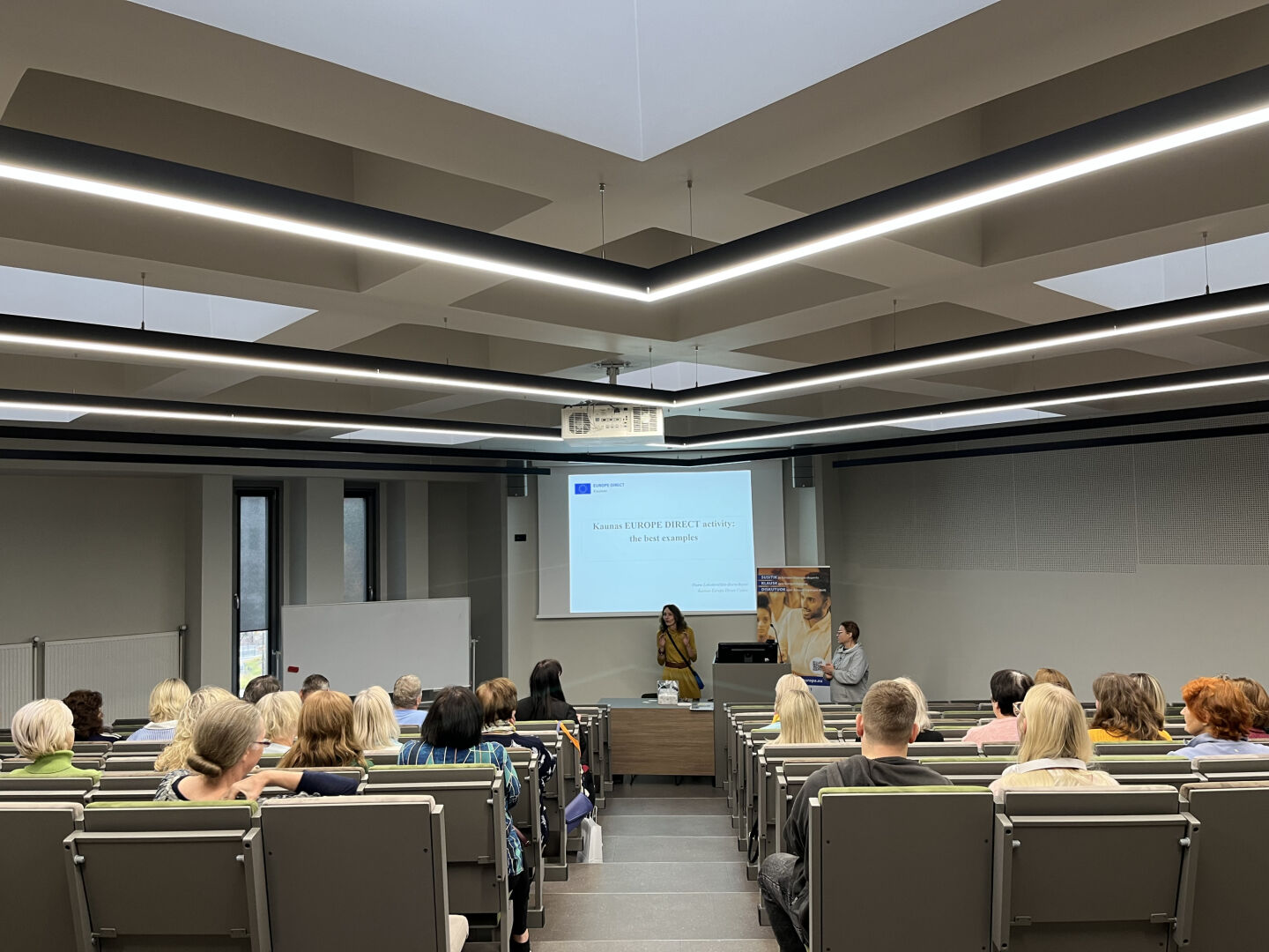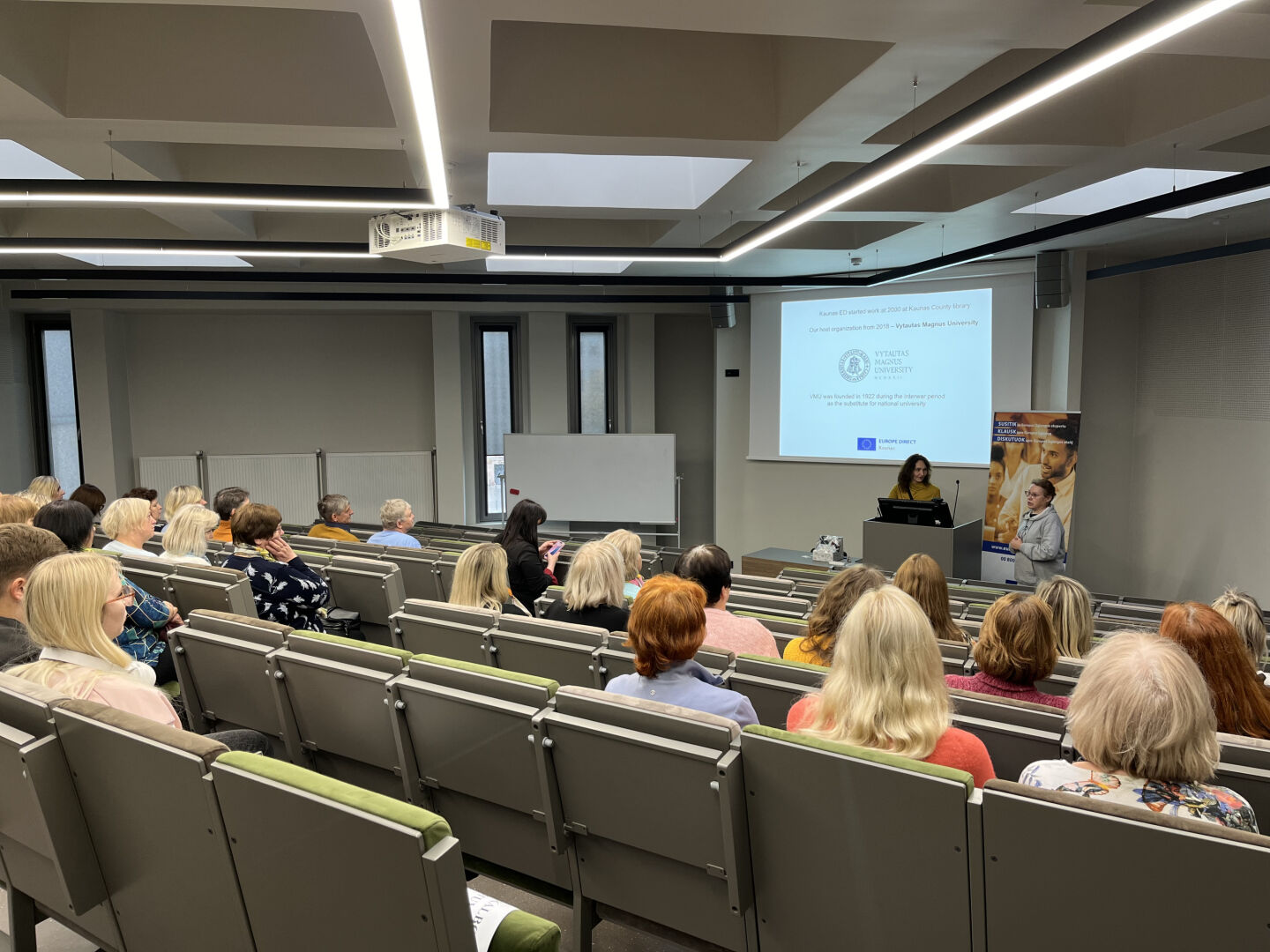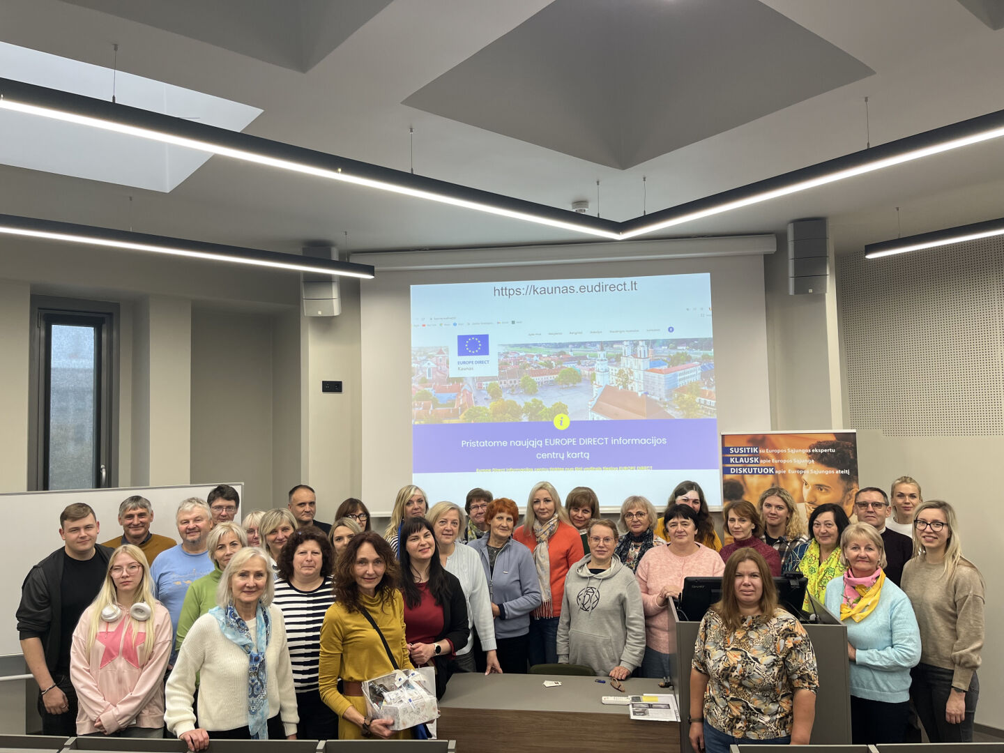 Pirmais pieturas punkts bija EUROPE DIRECT Kauņa, kas darbojas Vitauta Dižā Universitātes telpās. Centra vadītāja Diana Lukoševičiūtė-Burneikienė iepazīstināja ar centra darbu un veiksmīgākajiem pasākumiem. Viens no populārākajiem – erudīcijas konkurss par Eiropas jautājumiem, kas katru gadu notiek martā un pulcē jauniešus no visas Lietuvas. Interesanti, ka konkursa uzvarētājiem nereti tiek piešķirta balva – vizīte Eiropas Parlamentā Briselē.