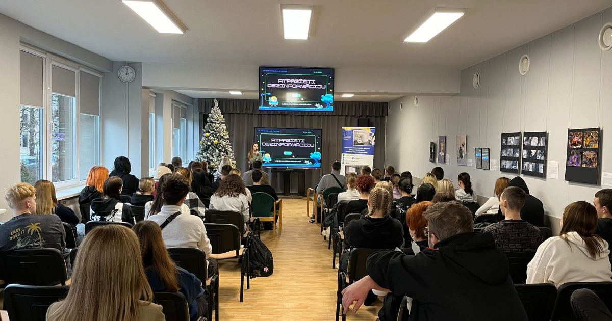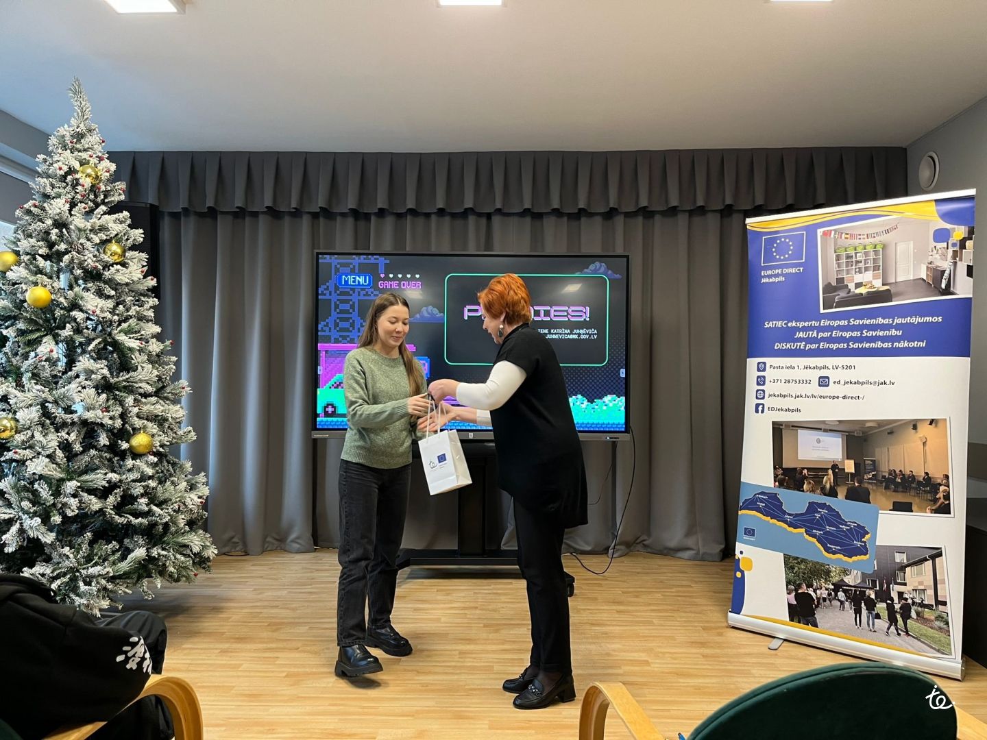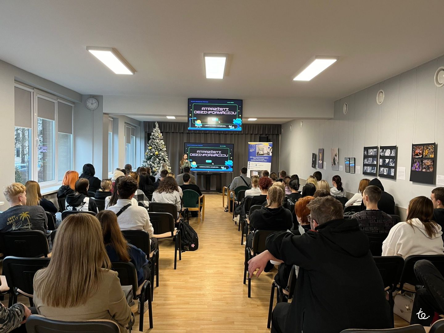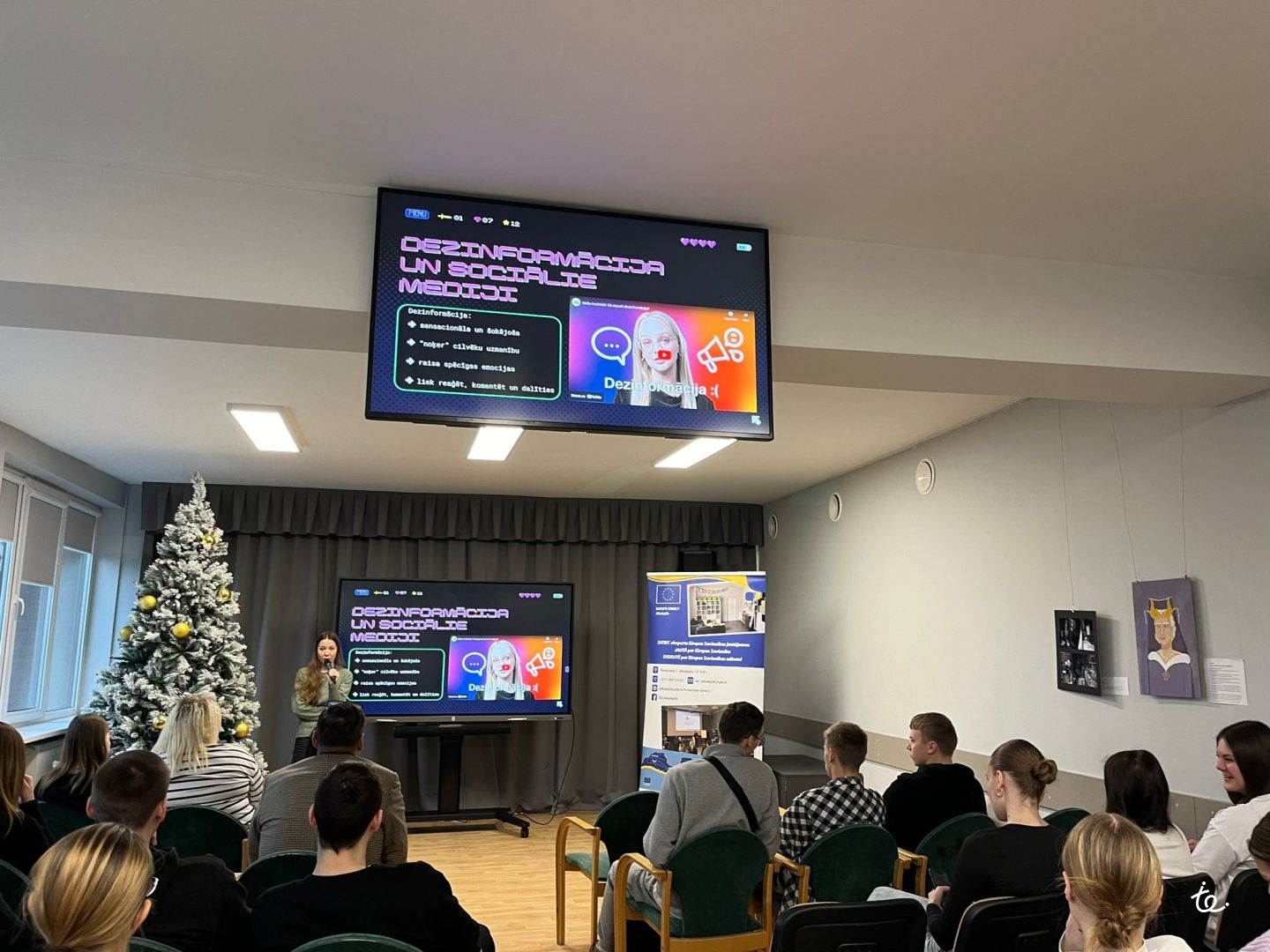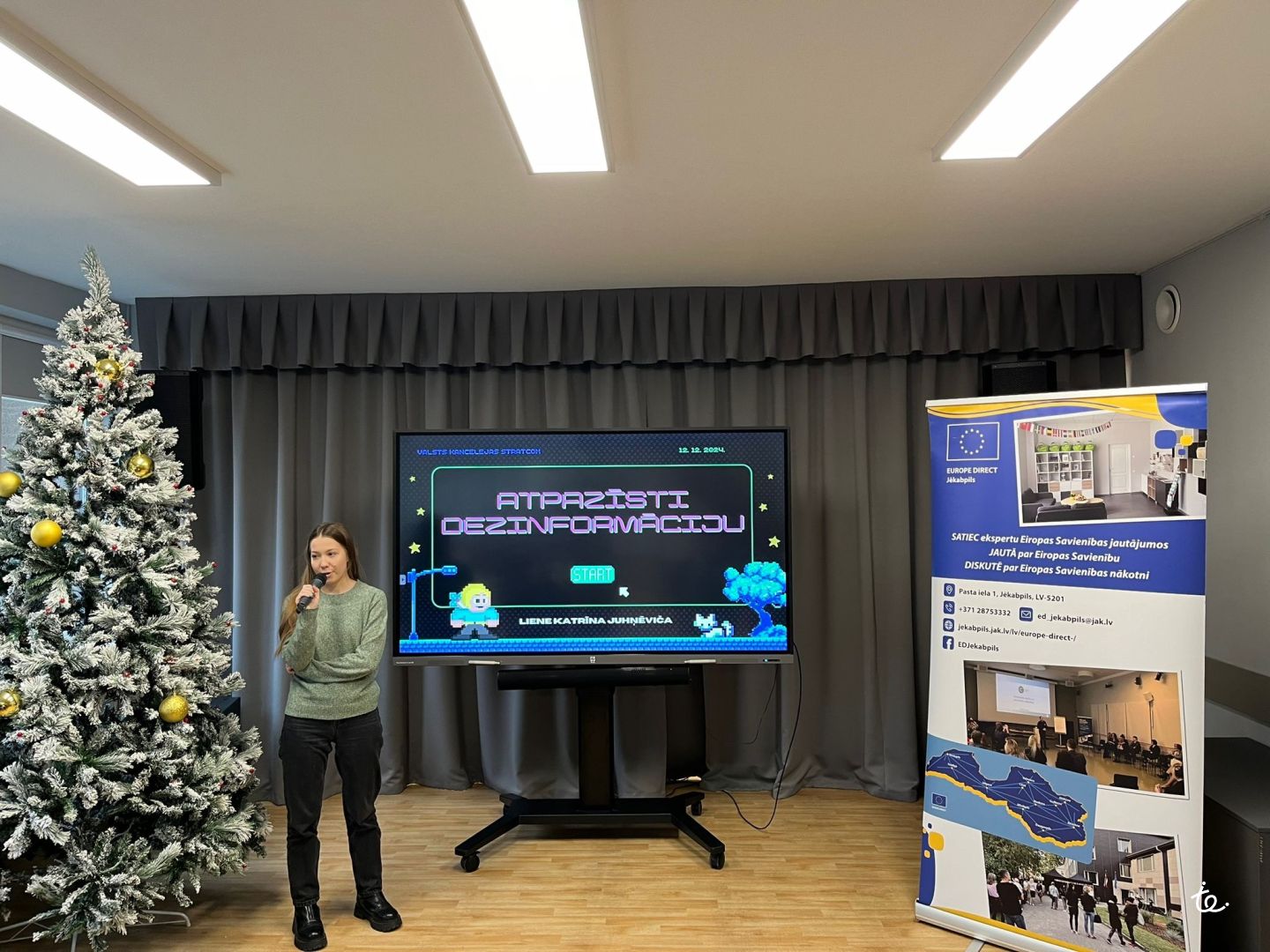 Decembrī EUROPE DIRECT Jēkabpils centrā viesojās pārstāve no Valsts Kancelejas Liene Katrīna Juhņēviča (Stratēģiskās komunikācijas un koordinācijas departamenta konsultante) un iepazīstināja Jēkabpils Tehnoloģiju tehnikuma audzēkņus un pedagogus ar interneta vietni “Melns uz balta” https://melnsuzbalta.lv/. Lekcijas klausītāji iepazina arī dažādus dezinformācijas piemērus, lai paaugstinātu savu kompetenci medijpratības jomā un spētu atpazīt dezinformāciju.