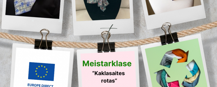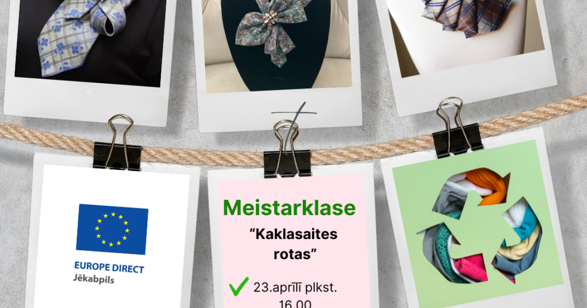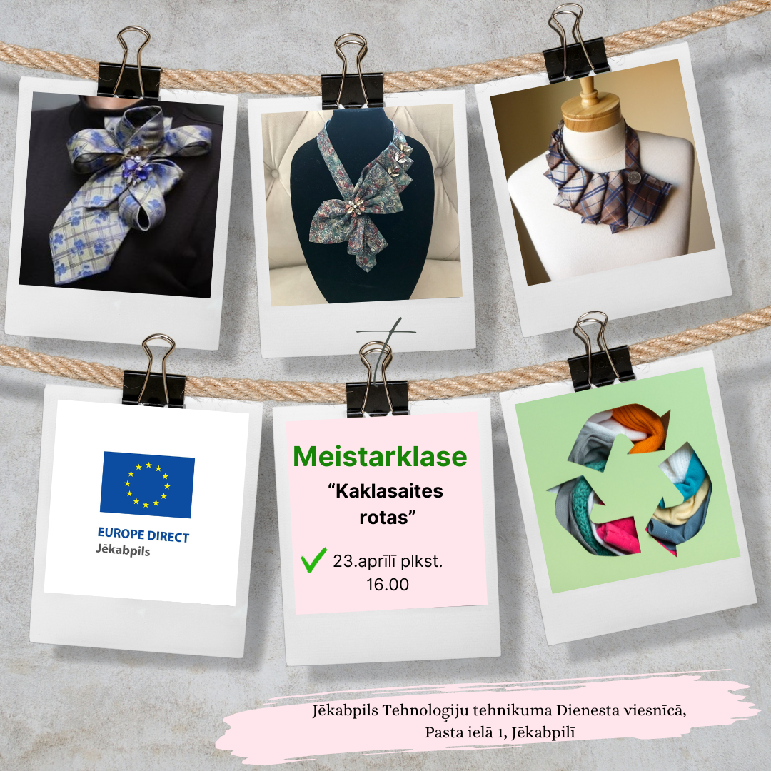 Tuvojoties Eiropas prasmju gada izskaņai EUROPE DIRECT Jēkabpils centrs ielūdz uz praktisku meistarklasi “Kaklasaišu rotas”. Innas Kokmanes vadībā piešķirsim otro elpu garderobes elementam kaklasaitēm. Būs iespēja izgatavot stilizētu kaklarotu vai brošu. Meistarklase notiks 23.aprīlī, plkst.16.00- 18.00 Jēkabpils Tehnoloģiju tehnikums Dienesta viesnīcā, Pasta ielā 1, Jēkabpilī.