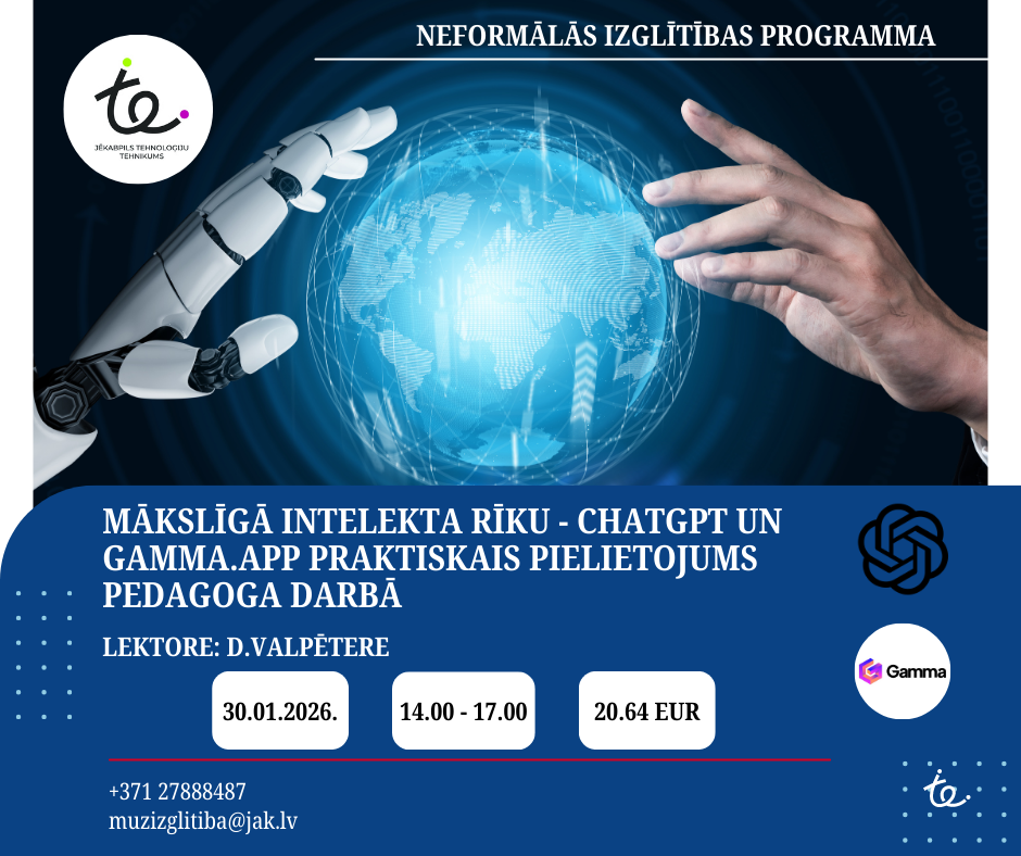 “Mākslīgā intelekta rīku – ChatGPT un Gamma.app praktiskais pielietojums pedagoga darbā” (4 akadēmiskās stundas).