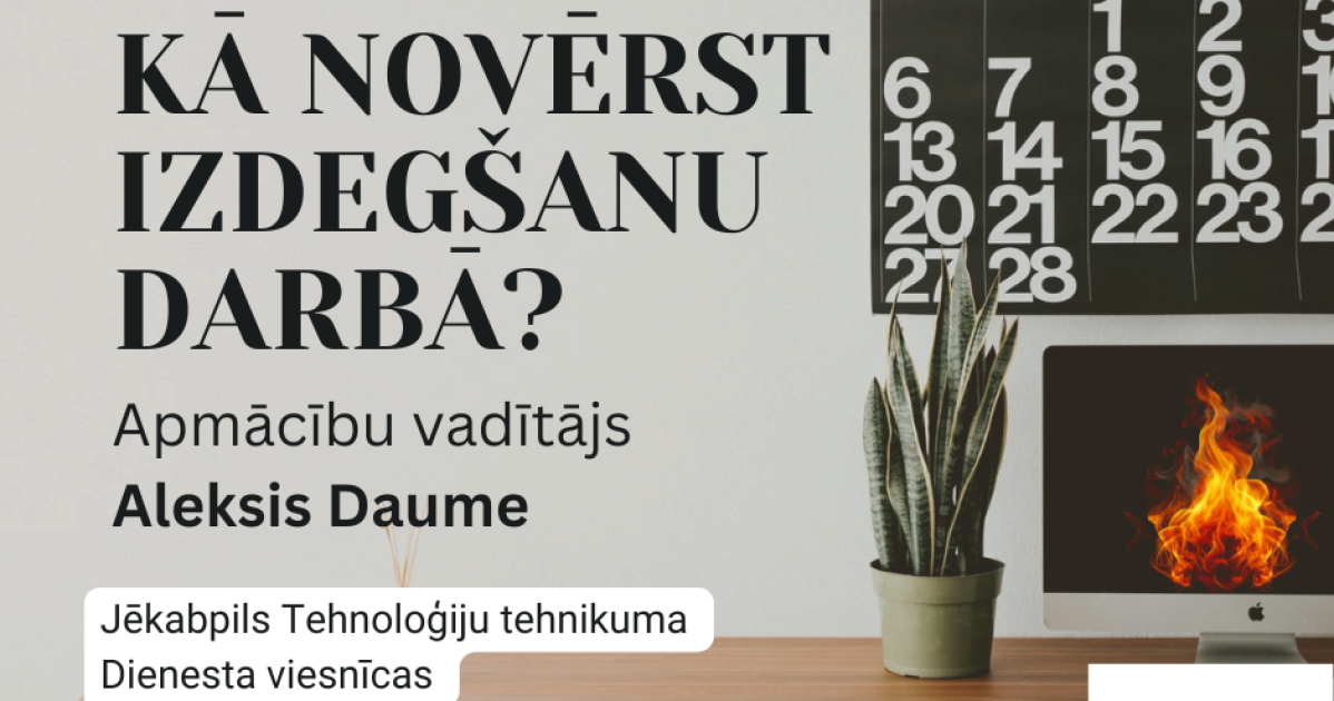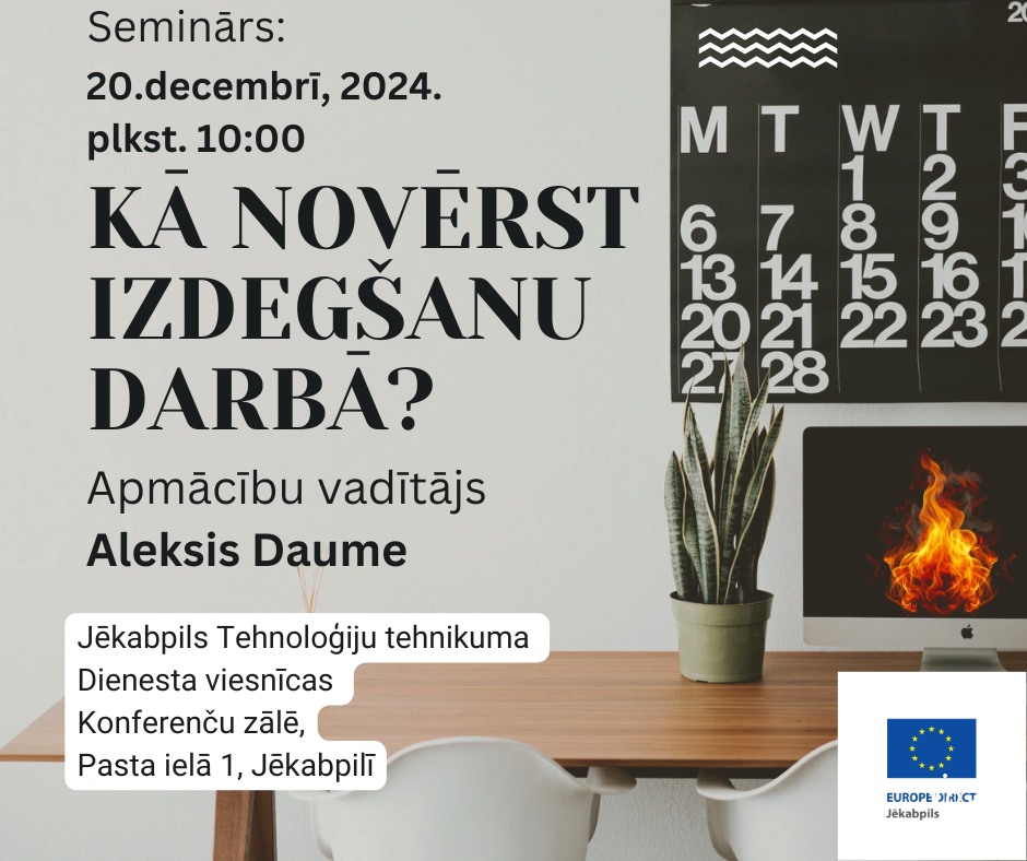 Lai veicinātu šo līdzsvaru EUROPE DIRECT Jēkabpils centrs sadarbībā ar Jēkabpils Tehnoloģiju tehnikuma Mūžizglītības nodaļu organizē klātienes semināru “Kā novērst izdegšanu darbā?”. Apmācību vadītājs Aleksis Daume sniegs praktiskus ieteikumus privātās un darba dzīves līdzsvara saglabāšanai. Semināra dalībnieki varēs smelties iedvesmu jaunu paradumu ieviešanai, sagaidot Jauno 2025.gadu.