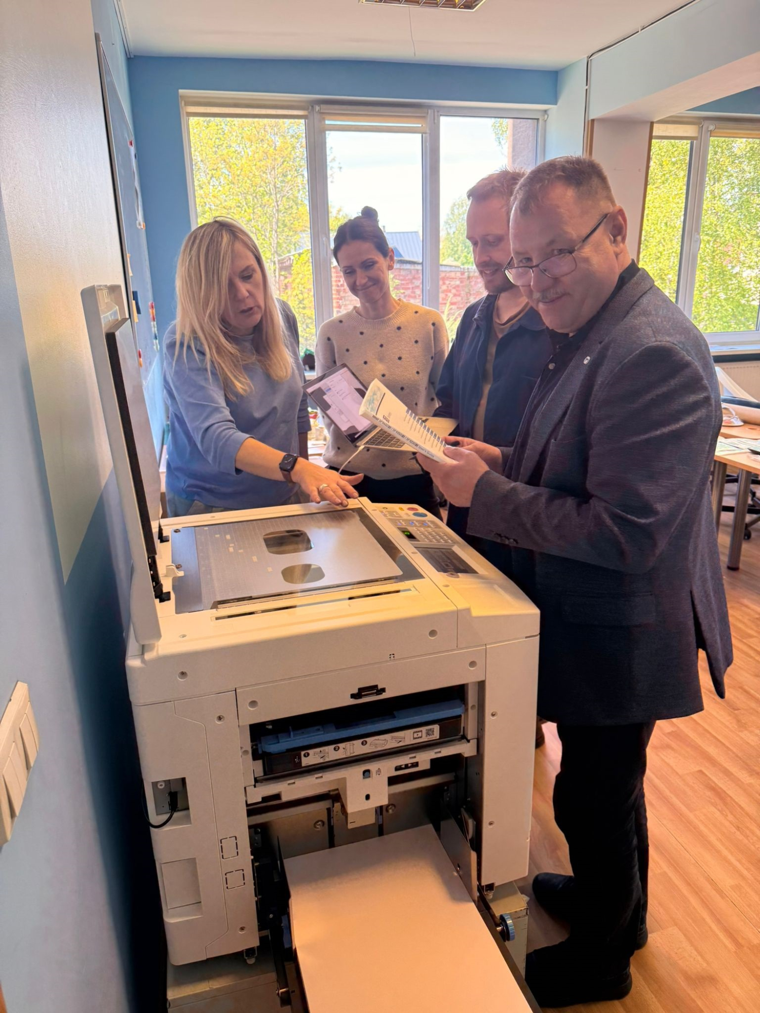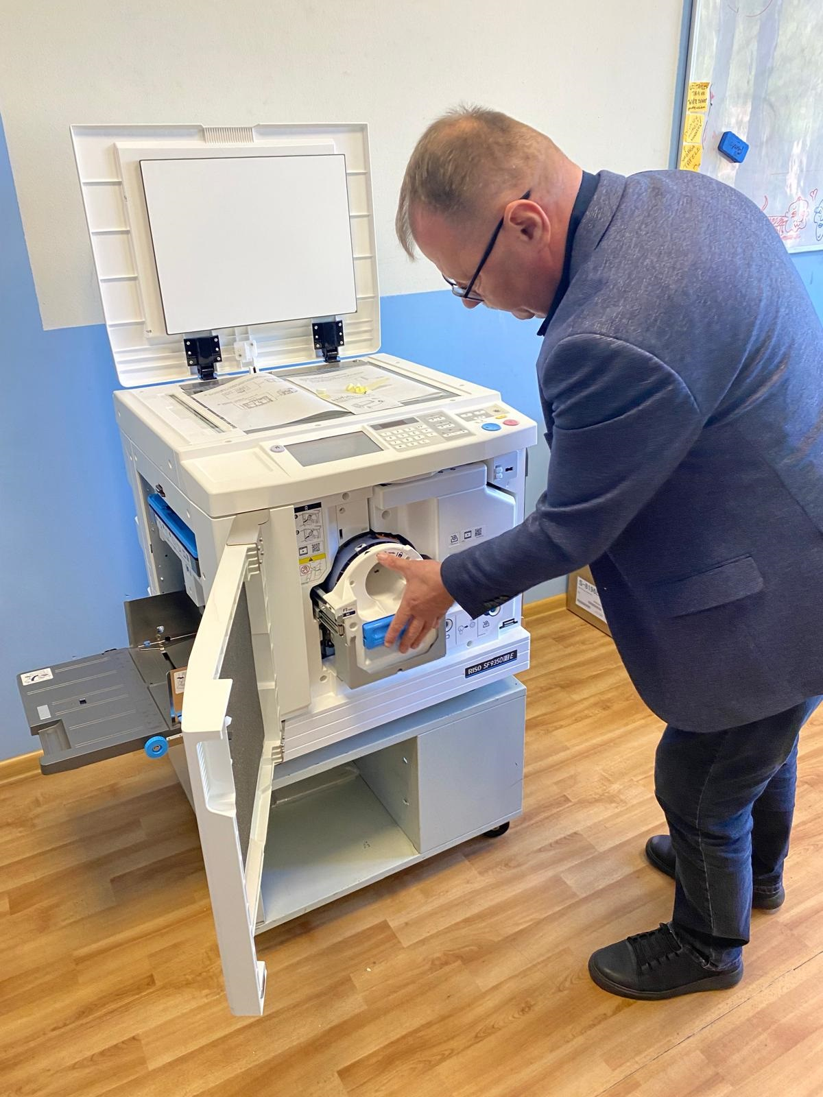 Pagājušajā nedēļā Tehnikumā sagaidījām pārstāvi no Lietuvas uzņēmuma UAB “Ciklonas” - risogrāfu iekārtu izplatītāji Baltijas reģionā un Tehnikumā uzstādīta risogrāfa iekārtu RISO SF 9350. Izglītības programmas "Komunikācijas dizains" pedagogiem tika novadīta ievadapmācība risogrāfa lietošanas un risogrāfijas dizaina metodes attīstībai izglītības iestādē. Jurijs Tatarkins - mākslinieks un Tehnikuma pedagogs ar pieredzi Risogrāfijā, zīnu festivālu organizētājs Latvijā atbalstīs Dizaina programmas pedagogus risogrāfijas tehnikās apguvē, lai turpmāk arī audzēkņu vidū būtu jauni talanti, kas piedalās Zīnu festivālos un ir konkurētspējīgāki mākslas jomā un darba tirgū.