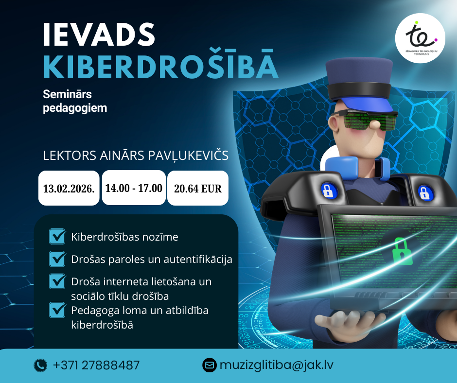 Jēkabpils Tehnoloģiju tehnikums organizē semināru pedagogiem “Ievads kiberdrošībā” (4 akadēmiskās stundas).